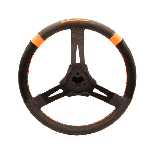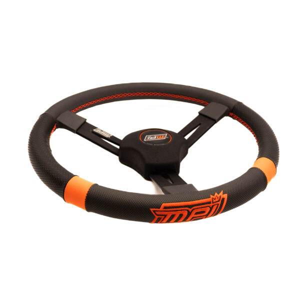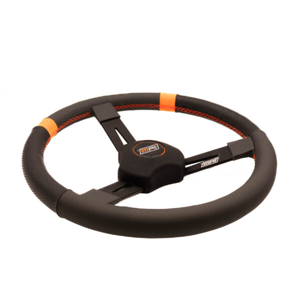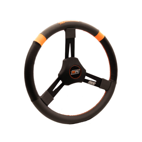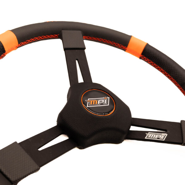The combination of carbon-look material with strategically applied extreme-grip carbon-look covering (MPI Hypergrip material) and MPI Orange™ cross-stitched detailing enhances hand grip, reduces fatigue, and allows confident one-handed control. MPI Orange™ markers provide both the driver and crew chief with a clear visual reference of the steering wheel position.