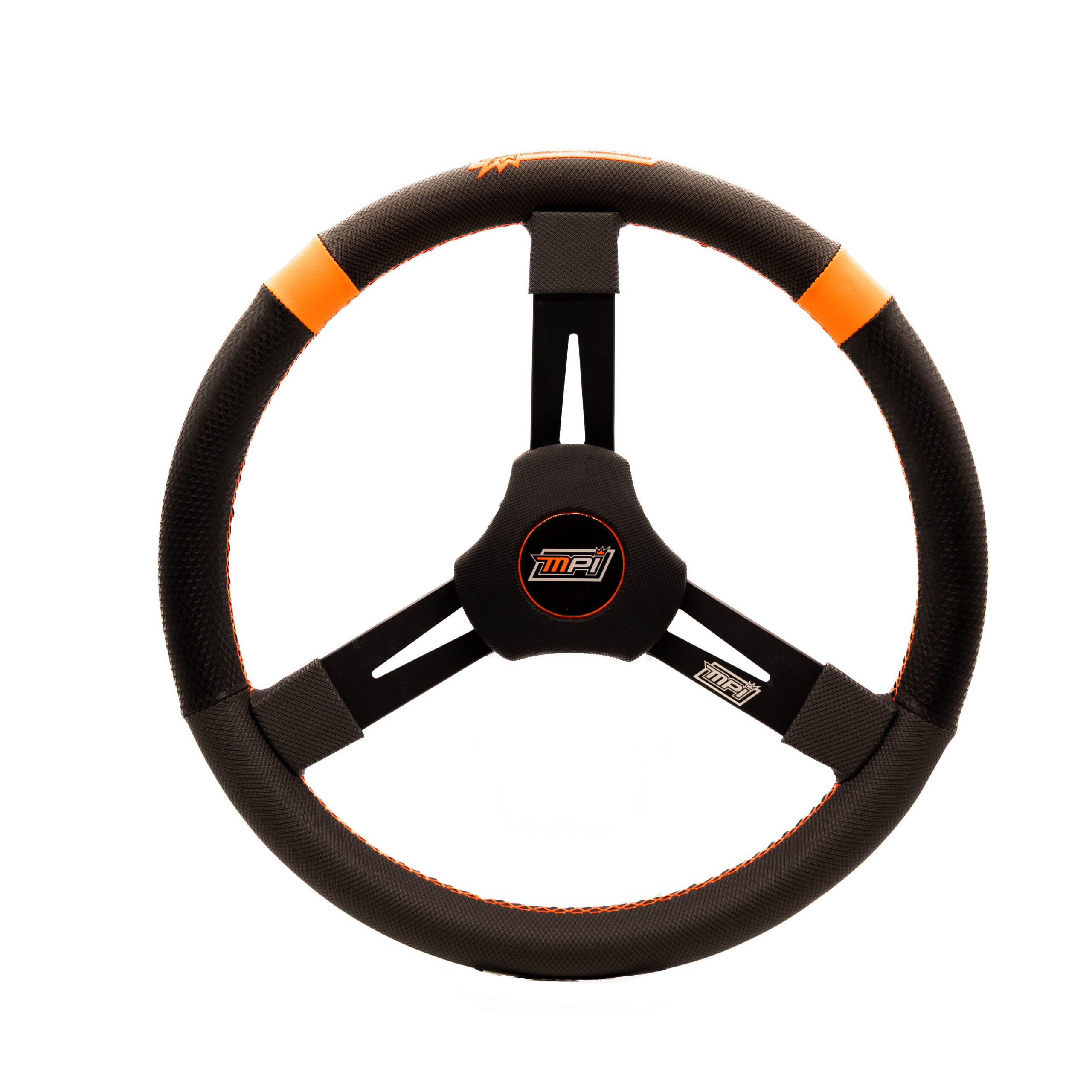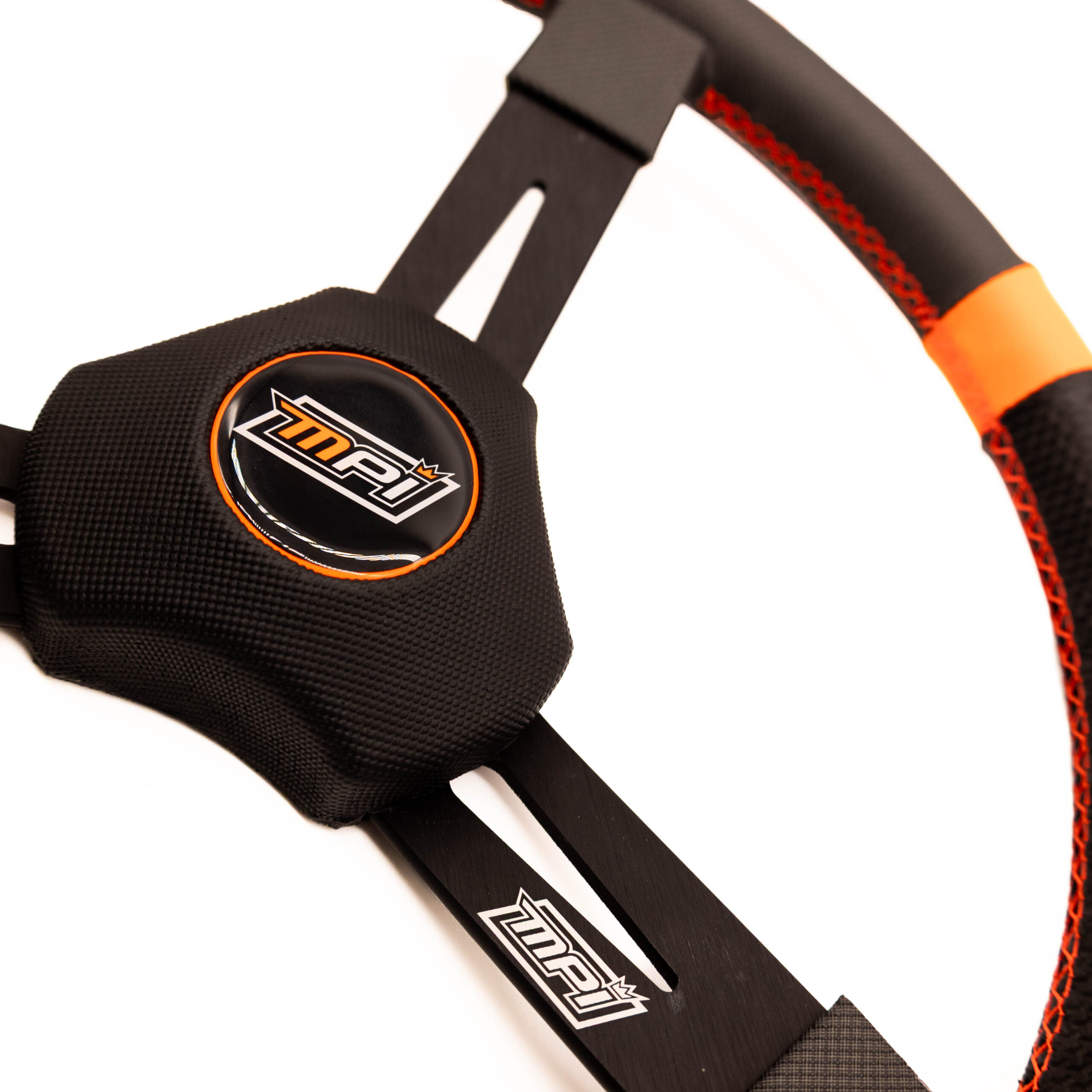 The combination of carbon-look material with strategically applied extreme-grip carbon-look covering (MPI Hypergrip material) and MPI Orange™ cross-stitched detailing enhances hand grip, reduces fatigue, and allows confident one-handed control. MPI Orange™ markers provide both the driver and crew chief with a clear visual reference of the steering wheel position.